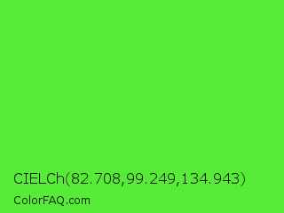 CIELCh 82.708,99.249,134.943 Color is a normal green color and the nearest color is Lime Green #32cd32. Hex code #55eb36 and RGB value is rgb(85,235,54). In RGB color space, this color is composed of 33% red, 92% green, 21% blue, In CMYK color space, this color is composed of 64% cyan, 0% magenta, 77% yellow , 8% black , In HSL color space, this color has a hue angle of 110° , 82% saturation and 57% lightness.