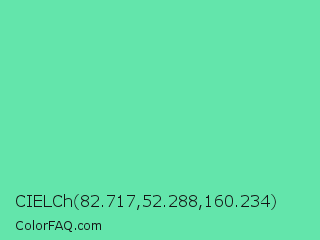 CIELCh 82.717,52.288,160.234 Color is a light green color and the nearest color is Medium Aquamarine #66ddaa. Hex code #63e5ab and RGB value is rgb(99,229,171). In RGB color space, this color is composed of 39% red, 90% green, 67% blue, In CMYK color space, this color is composed of 57% cyan, 0% magenta, 25% yellow , 10% black , In HSL color space, this color has a hue angle of 153° , 71% saturation and 64% lightness.