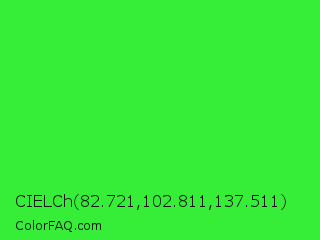 CIELCh 82.721,102.811,137.511 Color is a normal green color and the nearest color is Lime Green #32cd32. Hex code #36ed38 and RGB value is rgb(54,237,56). In RGB color space, this color is composed of 21% red, 93% green, 22% blue, In CMYK color space, this color is composed of 77% cyan, 0% magenta, 76% yellow , 7% black , In HSL color space, this color has a hue angle of 121° , 84% saturation and 57% lightness.