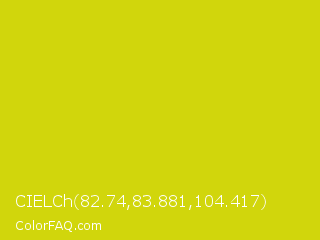 CIELCh 82.74,83.881,104.417 Color is a normal yellow color and the nearest color is Bitter Lemon #cae00d. Hex code #d1d60c and RGB value is rgb(209,214,12). In RGB color space, this color is composed of 82% red, 84% green, 5% blue, In CMYK color space, this color is composed of 2% cyan, 0% magenta, 94% yellow , 16% black , In HSL color space, this color has a hue angle of 61° , 89% saturation and 44% lightness.