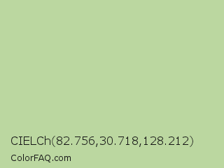 CIELCh 82.756,30.718,128.212 Color is a light green color and the nearest color is Sprout #c1d7b0. Hex code #bbd7a0 and RGB value is rgb(187,215,160). In RGB color space, this color is composed of 73% red, 84% green, 63% blue, In CMYK color space, this color is composed of 13% cyan, 0% magenta, 26% yellow , 16% black , In HSL color space, this color has a hue angle of 91° , 41% saturation and 74% lightness.