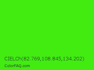 CIELCh 82.769,108.845,134.202 Color is a normal green color and the nearest color is Neon Green #39ff14. Hex code #41ed10 and RGB value is rgb(65,237,16). In RGB color space, this color is composed of 25% red, 93% green, 6% blue, In CMYK color space, this color is composed of 73% cyan, 0% magenta, 93% yellow , 7% black , In HSL color space, this color has a hue angle of 107° , 87% saturation and 50% lightness.