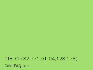 CIELCh 82.771,61.04,128.178 Color is a light green color and the nearest color is Inchworm #b2ec5d. Hex code #a3df70 and RGB value is rgb(163,223,112). In RGB color space, this color is composed of 64% red, 87% green, 44% blue, In CMYK color space, this color is composed of 27% cyan, 0% magenta, 50% yellow , 13% black , In HSL color space, this color has a hue angle of 92° , 63% saturation and 66% lightness.