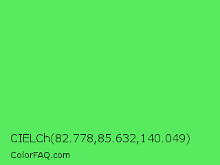 CIELCh 82.778,85.632,140.049 Color is a light green color and the nearest color is Screamin Green #66ff66. Hex code #58ea5f and RGB value is rgb(88,234,95). In RGB color space, this color is composed of 35% red, 92% green, 37% blue, In CMYK color space, this color is composed of 62% cyan, 0% magenta, 59% yellow , 8% black , In HSL color space, this color has a hue angle of 123° , 78% saturation and 63% lightness.