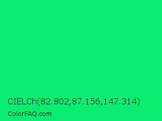 CIELCh 82.802,87.156,147.314 Color is a normal green color and the nearest color is Spring Green #00ff7f. Hex code #08ed70 and RGB value is rgb(8,237,112). In RGB color space, this color is composed of 3% red, 93% green, 44% blue, In CMYK color space, this color is composed of 97% cyan, 0% magenta, 53% yellow , 7% black , In HSL color space, this color has a hue angle of 147° , 93% saturation and 48% lightness.