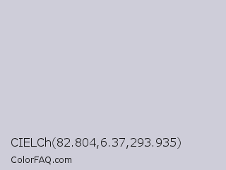 CIELCh 82.804,6.37,293.935 Color is a very light indigo color and the nearest color is Mischka #d1d2dd. Hex code #cecdd9 and RGB value is rgb(206,205,217). In RGB color space, this color is composed of 81% red, 80% green, 85% blue, In CMYK color space, this color is composed of 5% cyan, 6% magenta, 0% yellow , 15% black , In HSL color space, this color has a hue angle of 245° , 14% saturation and 83% lightness.