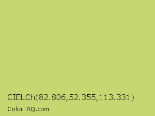 CIELCh 82.806,52.355,113.331 Color is a light yellow color and the nearest color is Yellow Green #c5e17a. Hex code #c6d771 and RGB value is rgb(198,215,113). In RGB color space, this color is composed of 78% red, 84% green, 44% blue, In CMYK color space, this color is composed of 8% cyan, 0% magenta, 47% yellow , 16% black , In HSL color space, this color has a hue angle of 70° , 56% saturation and 64% lightness.
