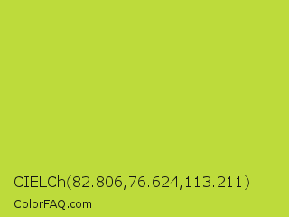 CIELCh 82.806,76.624,113.211 Color is a normal lime color and the nearest color is Pear #d1e231. Hex code #bddb3b and RGB value is rgb(189,219,59). In RGB color space, this color is composed of 74% red, 86% green, 23% blue, In CMYK color space, this color is composed of 14% cyan, 0% magenta, 73% yellow , 14% black , In HSL color space, this color has a hue angle of 71° , 69% saturation and 55% lightness.