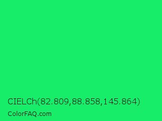 CIELCh 82.809,88.858,145.864 Color is a normal green color and the nearest color is Malachite #0bda51. Hex code #18ed6a and RGB value is rgb(24,237,106). In RGB color space, this color is composed of 9% red, 93% green, 42% blue, In CMYK color space, this color is composed of 90% cyan, 0% magenta, 55% yellow , 7% black , In HSL color space, this color has a hue angle of 143° , 86% saturation and 51% lightness.