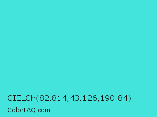 CIELCh 82.814,43.126,190.84 Color is a normal cyan color and the nearest color is Turquoise #40e0d0. Hex code #42e4dc and RGB value is rgb(66,228,220). In RGB color space, this color is composed of 26% red, 89% green, 86% blue, In CMYK color space, this color is composed of 71% cyan, 0% magenta, 4% yellow , 11% black , In HSL color space, this color has a hue angle of 177° , 75% saturation and 58% lightness.