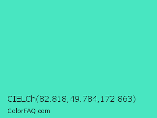CIELCh 82.818,49.784,172.863 Color is a normal cyan color and the nearest color is Turquoise #40e0d0. Hex code #48e6c1 and RGB value is rgb(72,230,193). In RGB color space, this color is composed of 28% red, 90% green, 76% blue, In CMYK color space, this color is composed of 69% cyan, 0% magenta, 16% yellow , 10% black , In HSL color space, this color has a hue angle of 166° , 76% saturation and 59% lightness.