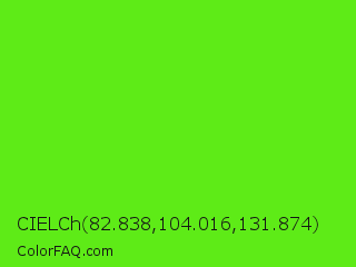 CIELCh 82.838,104.016,131.874 Color is a normal green color and the nearest color is Bright Green #66ff00. Hex code #5eeb17 and RGB value is rgb(94,235,23). In RGB color space, this color is composed of 37% red, 92% green, 9% blue, In CMYK color space, this color is composed of 60% cyan, 0% magenta, 90% yellow , 8% black , In HSL color space, this color has a hue angle of 100° , 84% saturation and 51% lightness.