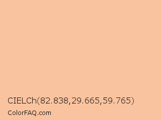 CIELCh 82.838,29.665,59.765 Color is a light orange color and the nearest color is Manhattan #f5c999. Hex code #fac39f and RGB value is rgb(250,195,159). In RGB color space, this color is composed of 98% red, 76% green, 62% blue, In CMYK color space, this color is composed of 0% cyan, 22% magenta, 36% yellow , 2% black , In HSL color space, this color has a hue angle of 24° , 90% saturation and 80% lightness.
