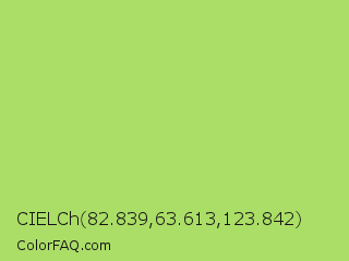 CIELCh 82.839,63.613,123.842 Color is a light green color and the nearest color is Inchworm #b2ec5d. Hex code #abde66 and RGB value is rgb(171,222,102). In RGB color space, this color is composed of 67% red, 87% green, 40% blue, In CMYK color space, this color is composed of 23% cyan, 0% magenta, 54% yellow , 13% black , In HSL color space, this color has a hue angle of 86° , 65% saturation and 64% lightness.