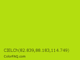 CIELCh 82.839,88.183,114.749 Color is a normal lime color and the nearest color is Inch Worm #b0e313. Hex code #b3de0f and RGB value is rgb(179,222,15). In RGB color space, this color is composed of 70% red, 87% green, 6% blue, In CMYK color space, this color is composed of 19% cyan, 0% magenta, 93% yellow , 13% black , In HSL color space, this color has a hue angle of 72° , 87% saturation and 46% lightness.