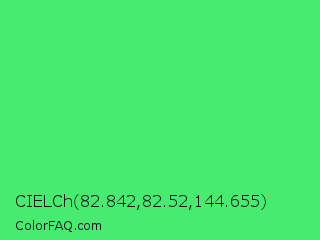 CIELCh 82.842,82.52,144.655 Color is a normal green color and the nearest color is UFO Green #3cd070. Hex code #46eb6f and RGB value is rgb(70,235,111). In RGB color space, this color is composed of 27% red, 92% green, 44% blue, In CMYK color space, this color is composed of 70% cyan, 0% magenta, 53% yellow , 8% black , In HSL color space, this color has a hue angle of 135° , 80% saturation and 60% lightness.