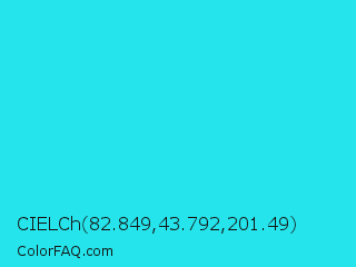 CIELCh 82.849,43.792,201.49 Color is a normal cyan color and the nearest color is Loeen #15f2fd. Hex code #25e4eb and RGB value is rgb(37,228,235). In RGB color space, this color is composed of 15% red, 89% green, 92% blue, In CMYK color space, this color is composed of 84% cyan, 3% magenta, 0% yellow , 8% black , In HSL color space, this color has a hue angle of 182° , 83% saturation and 53% lightness.