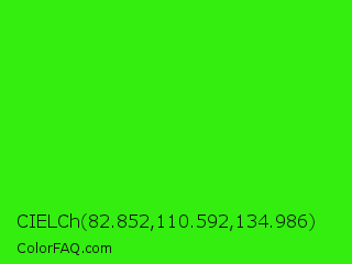 CIELCh 82.852,110.592,134.986 Color is a normal green color and the nearest color is Neon Green #39ff14. Hex code #33ee0e and RGB value is rgb(51,238,14). In RGB color space, this color is composed of 20% red, 93% green, 5% blue, In CMYK color space, this color is composed of 79% cyan, 0% magenta, 94% yellow , 7% black , In HSL color space, this color has a hue angle of 110° , 89% saturation and 49% lightness.