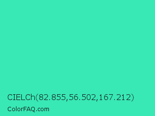 CIELCh 82.855,56.502,167.212 Color is a normal green color and the nearest color is Eucalyptus #44d7a8. Hex code #38e8b5 and RGB value is rgb(56,232,181). In RGB color space, this color is composed of 22% red, 91% green, 71% blue, In CMYK color space, this color is composed of 76% cyan, 0% magenta, 22% yellow , 9% black , In HSL color space, this color has a hue angle of 163° , 79% saturation and 56% lightness.