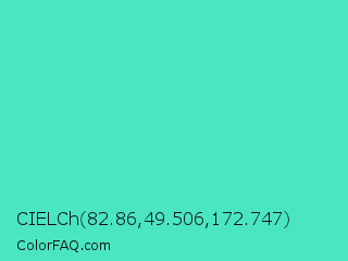 CIELCh 82.86,49.506,172.747 Color is a normal cyan color and the nearest color is Turquoise #40e0d0. Hex code #4ae6c1 and RGB value is rgb(74,230,193). In RGB color space, this color is composed of 29% red, 90% green, 76% blue, In CMYK color space, this color is composed of 68% cyan, 0% magenta, 16% yellow , 10% black , In HSL color space, this color has a hue angle of 166° , 76% saturation and 60% lightness.
