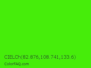 CIELCh 82.876,108.741,133.6 Color is a normal green color and the nearest color is Chlorophyll Green #4aff00. Hex code #47ed0a and RGB value is rgb(71,237,10). In RGB color space, this color is composed of 28% red, 93% green, 4% blue, In CMYK color space, this color is composed of 70% cyan, 0% magenta, 96% yellow , 7% black , In HSL color space, this color has a hue angle of 104° , 92% saturation and 48% lightness.