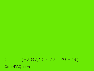 CIELCh 82.87,103.72,129.849 Color is a normal green color and the nearest color is Bright Green #66ff00. Hex code #6aea04 and RGB value is rgb(106,234,4). In RGB color space, this color is composed of 42% red, 92% green, 2% blue, In CMYK color space, this color is composed of 55% cyan, 0% magenta, 98% yellow , 8% black , In HSL color space, this color has a hue angle of 93° , 97% saturation and 47% lightness.