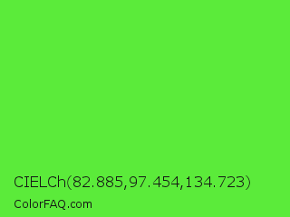 CIELCh 82.885,97.454,134.723 Color is a normal green color and the nearest color is Screamin Green #66ff66. Hex code #5beb3a and RGB value is rgb(91,235,58). In RGB color space, this color is composed of 36% red, 92% green, 23% blue, In CMYK color space, this color is composed of 61% cyan, 0% magenta, 75% yellow , 8% black , In HSL color space, this color has a hue angle of 109° , 82% saturation and 57% lightness.