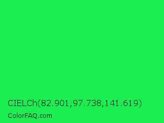 CIELCh 82.901,97.738,141.619 Color is a normal green color and the nearest color is Malachite #0bda51. Hex code #1bee51 and RGB value is rgb(27,238,81). In RGB color space, this color is composed of 11% red, 93% green, 32% blue, In CMYK color space, this color is composed of 89% cyan, 0% magenta, 66% yellow , 7% black , In HSL color space, this color has a hue angle of 135° , 86% saturation and 52% lightness.