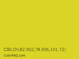 CIELCh 82.902,78.936,101.72 Color is a normal yellow color and the nearest color is Sunflower #e4d422. Hex code #d9d426 and RGB value is rgb(217,212,38). In RGB color space, this color is composed of 85% red, 83% green, 15% blue, In CMYK color space, this color is composed of 0% cyan, 2% magenta, 82% yellow , 15% black , In HSL color space, this color has a hue angle of 58° , 70% saturation and 50% lightness.