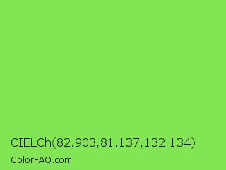 CIELCh 82.903,81.137,132.134 Color is a light green color and the nearest color is Kiwi #8ee53f. Hex code #82e654 and RGB value is rgb(130,230,84). In RGB color space, this color is composed of 51% red, 90% green, 33% blue, In CMYK color space, this color is composed of 43% cyan, 0% magenta, 63% yellow , 10% black , In HSL color space, this color has a hue angle of 101° , 74% saturation and 62% lightness.