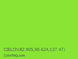 CIELCh 82.905,90.624,127.47 Color is a normal green color and the nearest color is Kiwi #8ee53f. Hex code #87e633 and RGB value is rgb(135,230,51). In RGB color space, this color is composed of 53% red, 90% green, 20% blue, In CMYK color space, this color is composed of 41% cyan, 0% magenta, 78% yellow , 10% black , In HSL color space, this color has a hue angle of 92° , 78% saturation and 55% lightness.