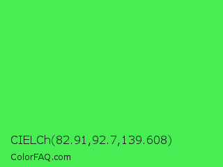 CIELCh 82.91,92.7,139.608 Color is a normal green color and the nearest color is Screamin Green #66ff66. Hex code #48ec53 and RGB value is rgb(72,236,83). In RGB color space, this color is composed of 28% red, 93% green, 33% blue, In CMYK color space, this color is composed of 69% cyan, 0% magenta, 65% yellow , 7% black , In HSL color space, this color has a hue angle of 124° , 81% saturation and 60% lightness.