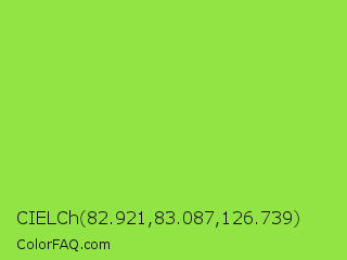 CIELCh 82.921,83.087,126.739 Color is a normal green color and the nearest color is Kiwi #8ee53f. Hex code #92e444 and RGB value is rgb(146,228,68). In RGB color space, this color is composed of 57% red, 89% green, 27% blue, In CMYK color space, this color is composed of 36% cyan, 0% magenta, 70% yellow , 11% black , In HSL color space, this color has a hue angle of 91° , 75% saturation and 58% lightness.