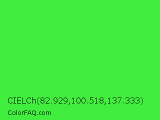 CIELCh 82.929,100.518,137.333 Color is a normal green color and the nearest color is Lime Green #32cd32. Hex code #41ed3d and RGB value is rgb(65,237,61). In RGB color space, this color is composed of 25% red, 93% green, 24% blue, In CMYK color space, this color is composed of 73% cyan, 0% magenta, 74% yellow , 7% black , In HSL color space, this color has a hue angle of 119° , 83% saturation and 58% lightness.