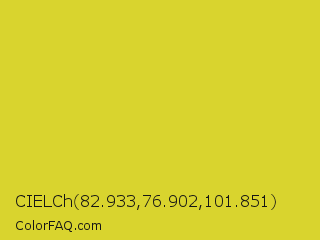 CIELCh 82.933,76.902,101.851 Color is a normal yellow color and the nearest color is Sunflower #e4d422. Hex code #d9d42e and RGB value is rgb(217,212,46). In RGB color space, this color is composed of 85% red, 83% green, 18% blue, In CMYK color space, this color is composed of 0% cyan, 2% magenta, 79% yellow , 15% black , In HSL color space, this color has a hue angle of 58° , 69% saturation and 52% lightness.