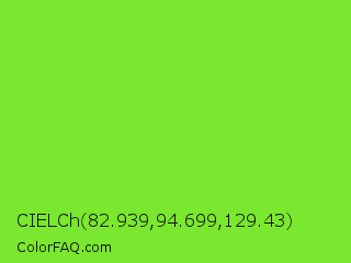 CIELCh 82.939,94.699,129.43 Color is a normal green color and the nearest color is Kiwi #8ee53f. Hex code #7ae82e and RGB value is rgb(122,232,46). In RGB color space, this color is composed of 48% red, 91% green, 18% blue, In CMYK color space, this color is composed of 47% cyan, 0% magenta, 80% yellow , 9% black , In HSL color space, this color has a hue angle of 95° , 80% saturation and 55% lightness.