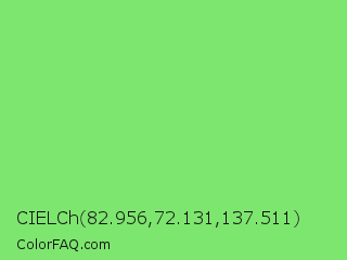 CIELCh 82.956,72.131,137.511 Color is a light green color and the nearest color is Pastel Green #77dd77. Hex code #7de66e and RGB value is rgb(125,230,110). In RGB color space, this color is composed of 49% red, 90% green, 43% blue, In CMYK color space, this color is composed of 46% cyan, 0% magenta, 52% yellow , 10% black , In HSL color space, this color has a hue angle of 113° , 71% saturation and 67% lightness.
