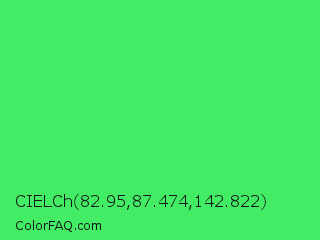 CIELCh 82.95,87.474,142.822 Color is a normal green color and the nearest color is UFO Green #3cd070. Hex code #42ec64 and RGB value is rgb(66,236,100). In RGB color space, this color is composed of 26% red, 93% green, 39% blue, In CMYK color space, this color is composed of 72% cyan, 0% magenta, 58% yellow , 7% black , In HSL color space, this color has a hue angle of 132° , 82% saturation and 59% lightness.