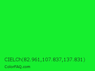 CIELCh 82.961,107.837,137.831 Color is a normal green color and the nearest color is Vivid Malachite #00cc33. Hex code #15ef2e and RGB value is rgb(21,239,46). In RGB color space, this color is composed of 8% red, 94% green, 18% blue, In CMYK color space, this color is composed of 91% cyan, 0% magenta, 81% yellow , 6% black , In HSL color space, this color has a hue angle of 127° , 87% saturation and 51% lightness.