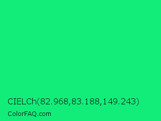CIELCh 82.968,83.188,149.243 Color is a normal green color and the nearest color is Spring Green #00ff7f. Hex code #12ed7a and RGB value is rgb(18,237,122). In RGB color space, this color is composed of 7% red, 93% green, 48% blue, In CMYK color space, this color is composed of 92% cyan, 0% magenta, 49% yellow , 7% black , In HSL color space, this color has a hue angle of 148° , 86% saturation and 50% lightness.
