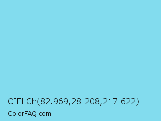 CIELCh 82.969,28.208,217.622 Color is a light cyan color and the nearest color is Medium Sky Blue #80daeb. Hex code #82dcee and RGB value is rgb(130,220,238). In RGB color space, this color is composed of 51% red, 86% green, 93% blue, In CMYK color space, this color is composed of 45% cyan, 8% magenta, 0% yellow , 7% black , In HSL color space, this color has a hue angle of 190° , 76% saturation and 72% lightness.
