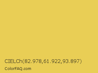 CIELCh 82.978,61.922,93.897 Color is a light yellow color and the nearest color is Confetti #e9d75a. Hex code #e9ce55 and RGB value is rgb(233,206,85). In RGB color space, this color is composed of 91% red, 81% green, 33% blue, In CMYK color space, this color is composed of 0% cyan, 12% magenta, 64% yellow , 9% black , In HSL color space, this color has a hue angle of 49° , 77% saturation and 62% lightness.