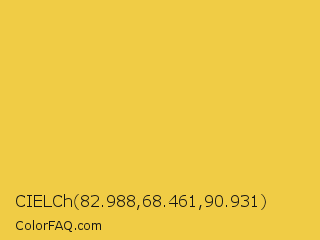 CIELCh 82.988,68.461,90.931 Color is a light yellow color and the nearest color is Sandstorm #ecd540. Hex code #f0cc45 and RGB value is rgb(240,204,69). In RGB color space, this color is composed of 94% red, 80% green, 27% blue, In CMYK color space, this color is composed of 0% cyan, 15% magenta, 71% yellow , 6% black , In HSL color space, this color has a hue angle of 47° , 85% saturation and 61% lightness.