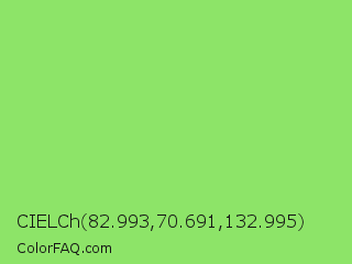 CIELCh 82.993,70.691,132.995 Color is a light green color and the nearest color is Pastel Green #77dd77. Hex code #8de468 and RGB value is rgb(141,228,104). In RGB color space, this color is composed of 55% red, 89% green, 41% blue, In CMYK color space, this color is composed of 38% cyan, 0% magenta, 54% yellow , 11% black , In HSL color space, this color has a hue angle of 102° , 70% saturation and 65% lightness.