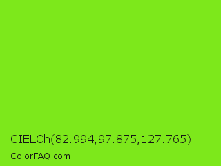 CIELCh 82.994,97.875,127.765 Color is a normal green color and the nearest color is Alien Armpit #84de02. Hex code #7de81b and RGB value is rgb(125,232,27). In RGB color space, this color is composed of 49% red, 91% green, 11% blue, In CMYK color space, this color is composed of 46% cyan, 0% magenta, 88% yellow , 9% black , In HSL color space, this color has a hue angle of 91° , 82% saturation and 51% lightness.