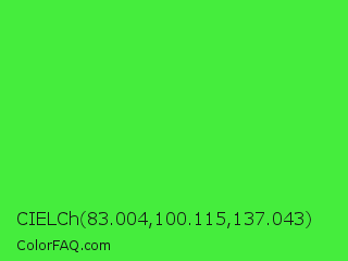 CIELCh 83.004,100.115,137.043 Color is a normal green color and the nearest color is Lime Green #32cd32. Hex code #45ed3d and RGB value is rgb(69,237,61). In RGB color space, this color is composed of 27% red, 93% green, 24% blue, In CMYK color space, this color is composed of 71% cyan, 0% magenta, 74% yellow , 7% black , In HSL color space, this color has a hue angle of 117° , 83% saturation and 58% lightness.
