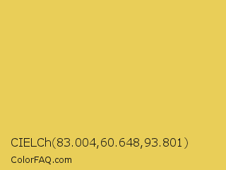 CIELCh 83.004,60.648,93.801 Color is a light yellow color and the nearest color is Confetti #e9d75a. Hex code #e9ce58 and RGB value is rgb(233,206,88). In RGB color space, this color is composed of 91% red, 81% green, 35% blue, In CMYK color space, this color is composed of 0% cyan, 12% magenta, 62% yellow , 9% black , In HSL color space, this color has a hue angle of 49° , 77% saturation and 63% lightness.