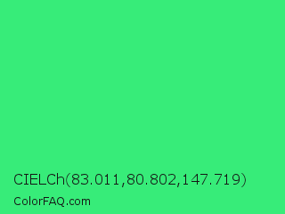 CIELCh 83.011,80.802,147.719 Color is a normal green color and the nearest color is UFO Green #3cd070. Hex code #37ec79 and RGB value is rgb(55,236,121). In RGB color space, this color is composed of 22% red, 93% green, 47% blue, In CMYK color space, this color is composed of 77% cyan, 0% magenta, 49% yellow , 7% black , In HSL color space, this color has a hue angle of 142° , 83% saturation and 57% lightness.