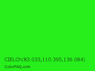 CIELCh 83.033,110.395,136.084 Color is a normal green color and the nearest color is Neon Green #39ff14. Hex code #26ef1b and RGB value is rgb(38,239,27). In RGB color space, this color is composed of 15% red, 94% green, 11% blue, In CMYK color space, this color is composed of 84% cyan, 0% magenta, 89% yellow , 6% black , In HSL color space, this color has a hue angle of 117° , 87% saturation and 52% lightness.