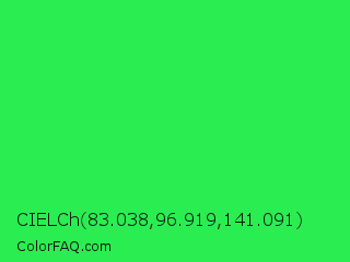 CIELCh 83.038,96.919,141.091 Color is a normal green color and the nearest color is Malachite #0bda51. Hex code #2aee51 and RGB value is rgb(42,238,81). In RGB color space, this color is composed of 16% red, 93% green, 32% blue, In CMYK color space, this color is composed of 82% cyan, 0% magenta, 66% yellow , 7% black , In HSL color space, this color has a hue angle of 132° , 85% saturation and 55% lightness.